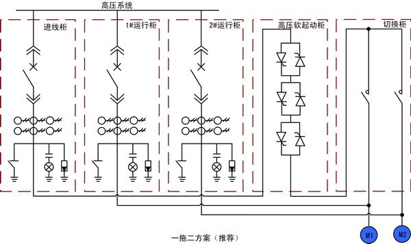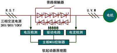 当电机达到全速运行后,电机电流降到正常运行的电流值,软起动器装置输出旁路命令,从而使旁路高压真空接触器闭合,使电机电流经过旁路接触器,防止可控硅导通所产生的压降引起的热损耗,提高了工作效率和可靠性。