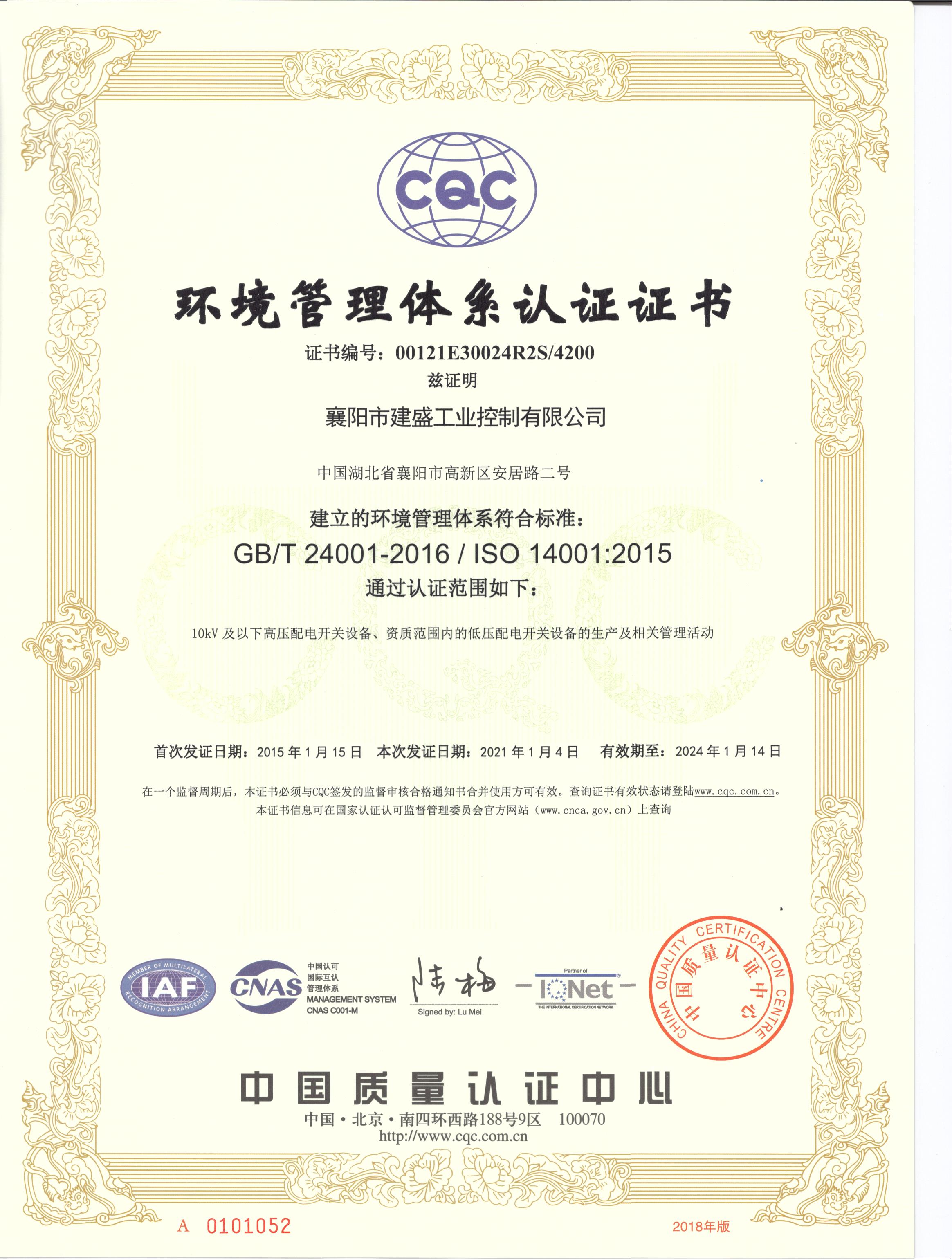 环境管理体系认证证书