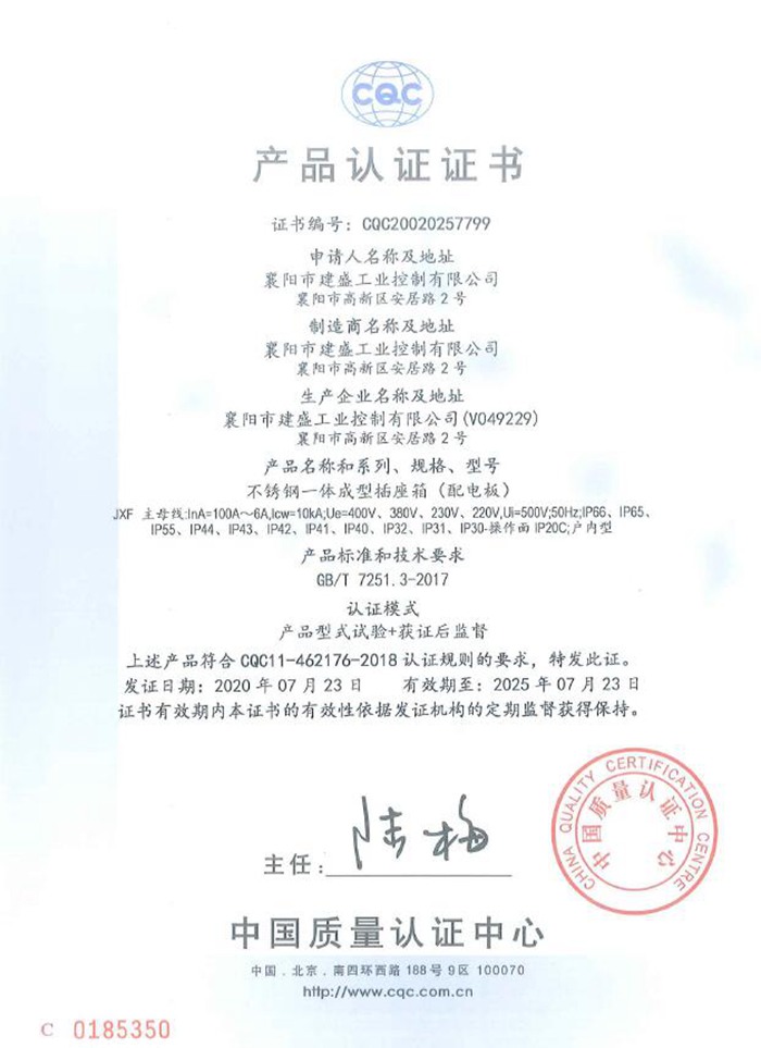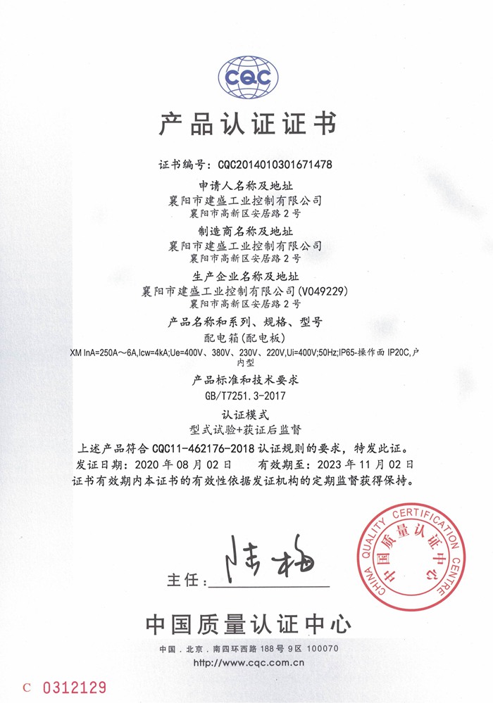 XM配电箱CQC认证证书