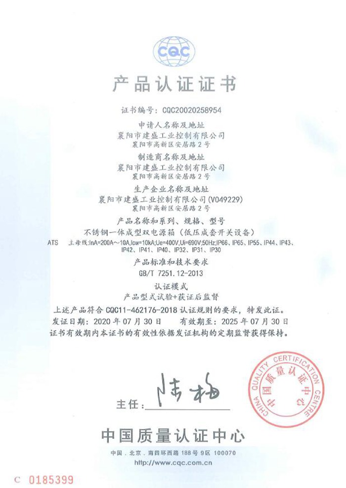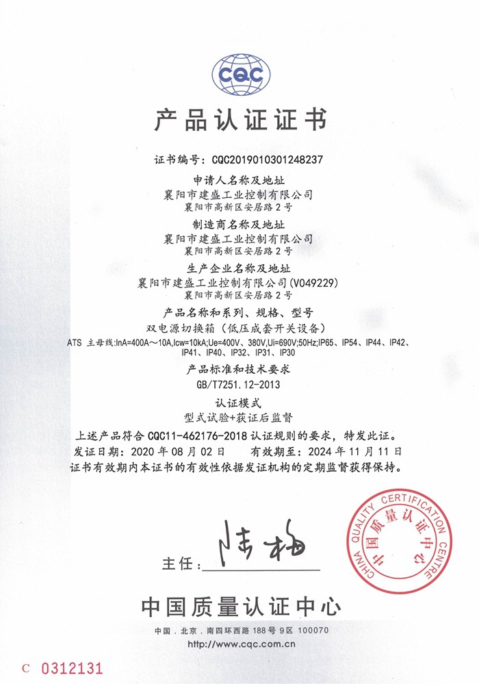 ATS双电源箱CQC认证证书